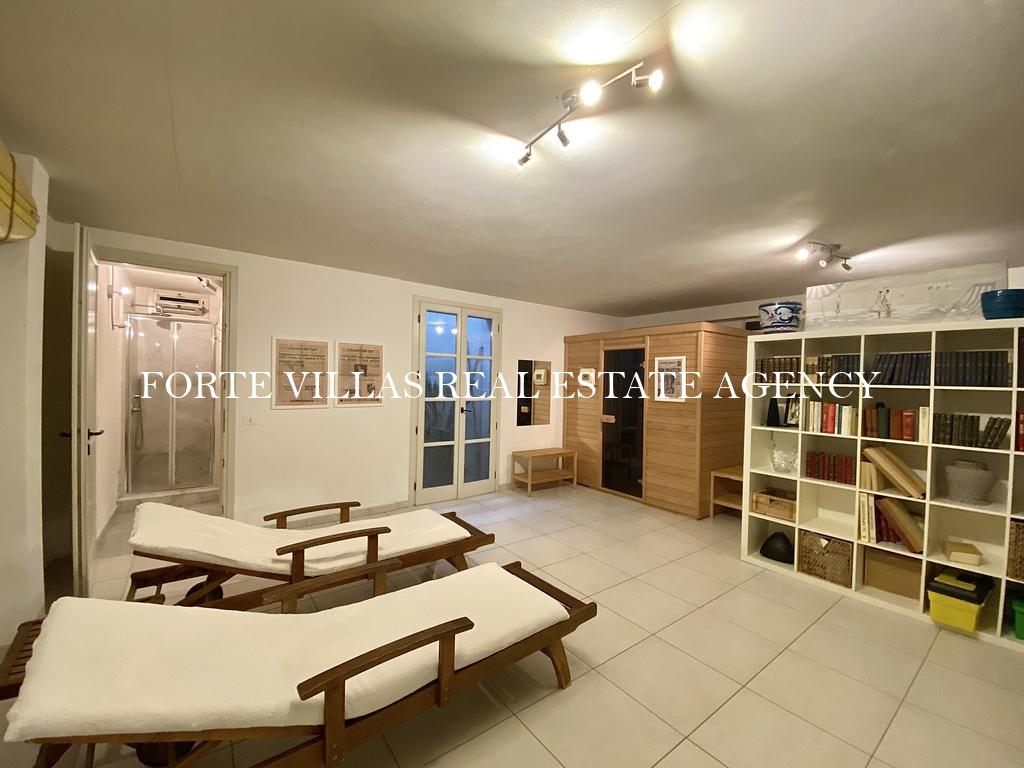 Ground floor: Hall, large double living room with fireplace and a library, kitchen (30 sqm) with fireplace and access to the terrace with a dining area, 1 bedroom and 1 bathroom, 1 bathroom service. First floor: 4 bedrooms and 4 bathrooms, studium room, terrace. Taverna: Living area with sofa, 1 bedroom and 1 bathroom, sauna, gym. The villa is equipped with air conditioning, alarm, Internet.