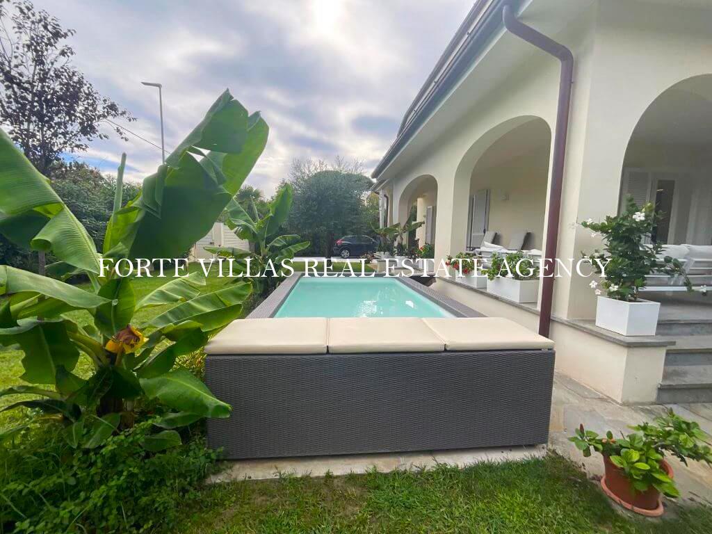 Bellissima villa bifamiliare in affitto a forte dei marmi a 500-600 m dal mare della Versilia con grande giardino e piccola piscina rialzata.