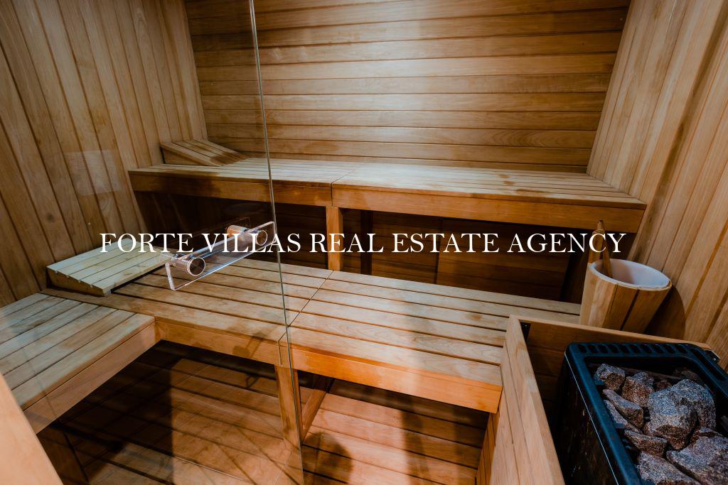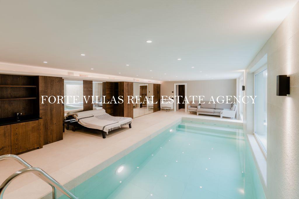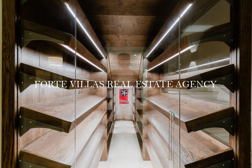 Completa l'immobile di lusso il piano interrato, che ospita una splendida cantina per i vini in cristallo, due ulteriori camere da letto matrimoniali con bagno en suite e una prestigiosa piscina interna,