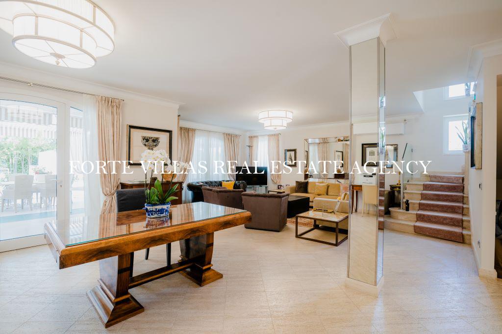 -Первый этаж -гостинная,открытая кухня и профессиональная кухня,служебная ванная комната,столовая,1 спальня,1 ванная комната и 2 веранды,1 выходит на к бассейну,а 2-ая в сад.